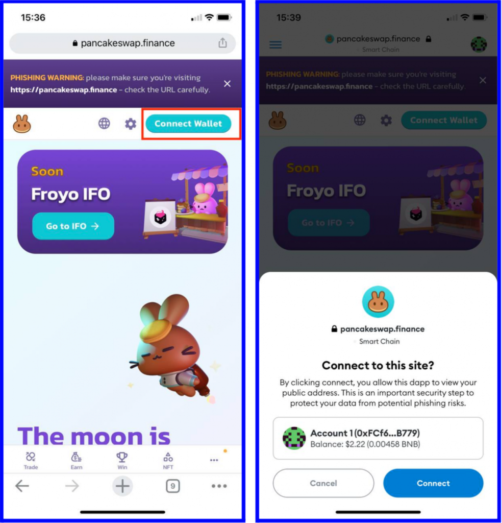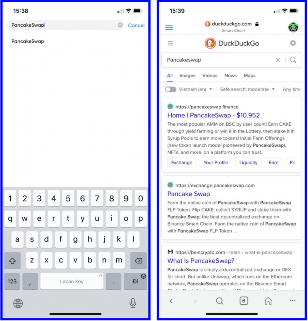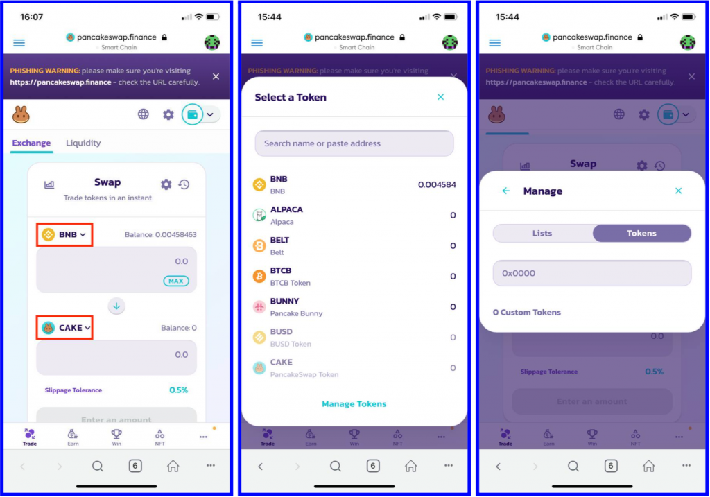 Step 1: Open your Metamask app then press the Menu button on the main screen, then press Browser. Type PancakeSwap on the search bar and select the first result https://pancakeswap.finance/. Next, we will connect the PancakeSwap to your Metamask to swap directly on your wallet.