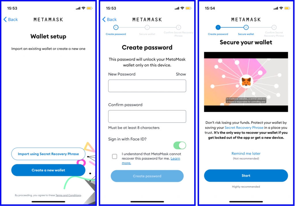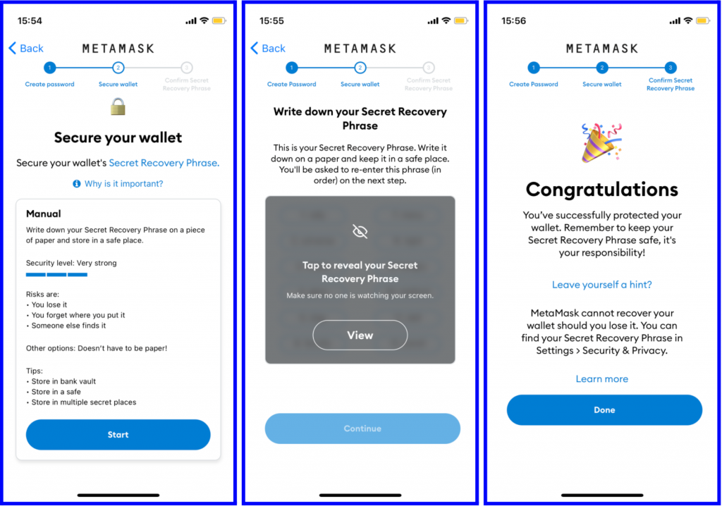 Step 2: Open the app then choose to create a new wallet. You will be asked to start the security process of backing up your 12-word secret phrase.