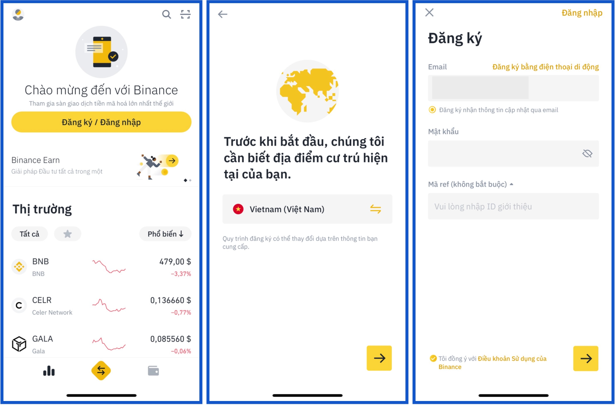 Bước 2: Nhấn vào ứng dụng Binance trên điện thoại của bạn để đăng ký tài khoản mới. Nhấp vào nút Đăng ký / Đăng nhập để bắt đầu. Bạn có thể đăng ký qua email hoặc điện thoại di động, nhưng chúng tôi khuyến khích bạn sử dụng email vì đôi khi bạn có thể không nhận được mã xác minh qua số điện thoại do lỗi nhà cung cấp dịch vụ. Nhập email và mật khẩu mong muốn của bạn để tiếp tục.