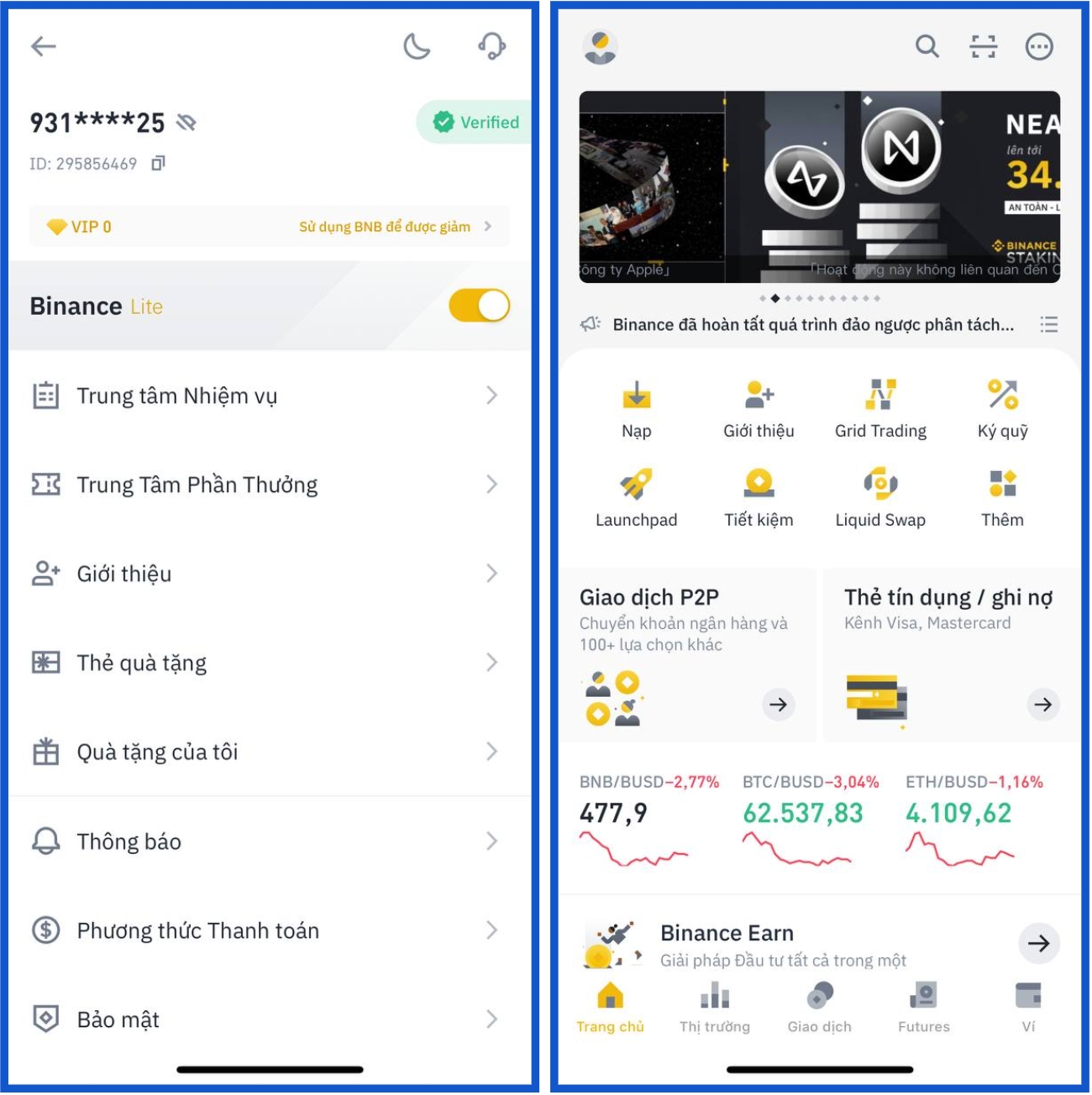 Bước 5 : Theo mặc định, tất cả người dùng mới sẽ xem ứng dụng ở chế độ Lite, để có thể kích hoạt và sử dụng Binance Pay, vui lòng nhấp vào biểu tượng người dùng trên trang chủ và tắt chế độ Lite. Trang chủ của chế độ Binance Pro sẽ giống như hình bên phải bên dưới.