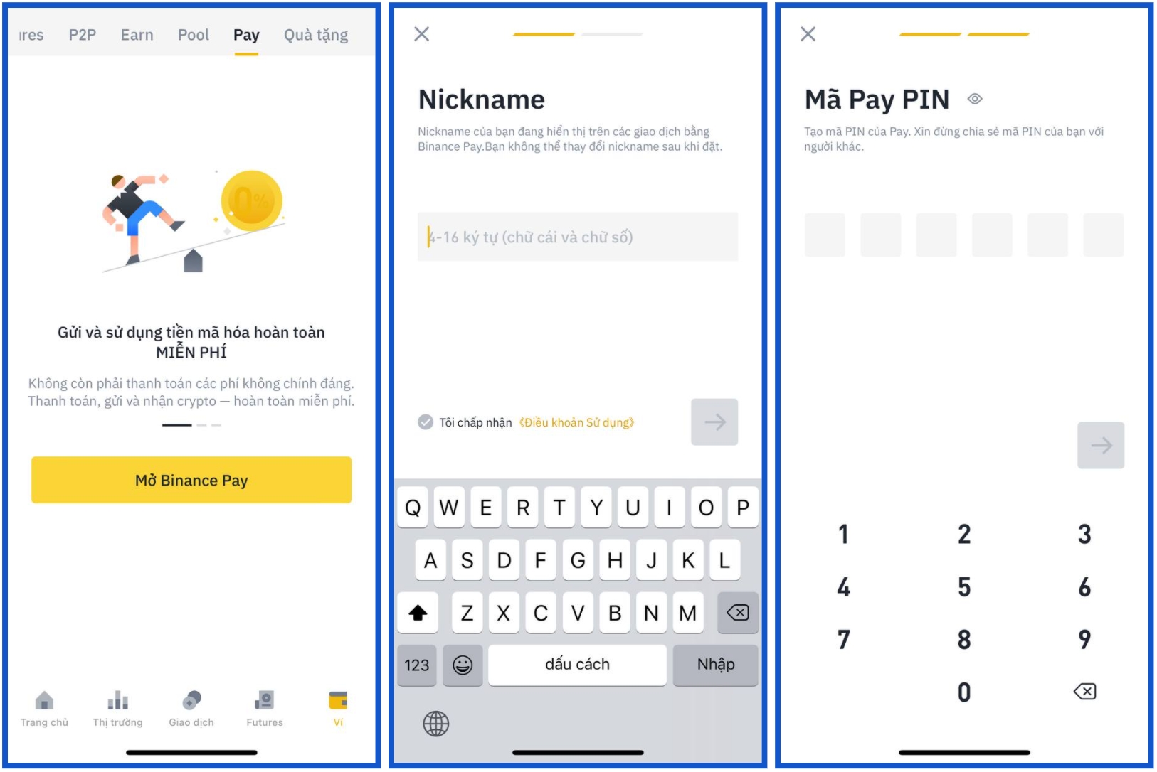 Bước 6 : Tiếp theo, nhấp vào biểu tượng Ví ở cuối màn hình, sau đó vuốt màn hình đến phần Pay để bắt đầu kích hoạt Binance Pay. Bạn nhập Nickname bạn muốn sử dụng trong Binance Pay, cũng như Mã Pin Pay bạn sẽ sử dụng để hoàn tất quá trình kích hoạt. (Vui lòng lưu mã PIN Binance Pay của bạn một cách cẩn thận). Bạn có thể phải kích hoạt Xác thực hai yếu tố (2fa) để hoàn tất quy trình.
