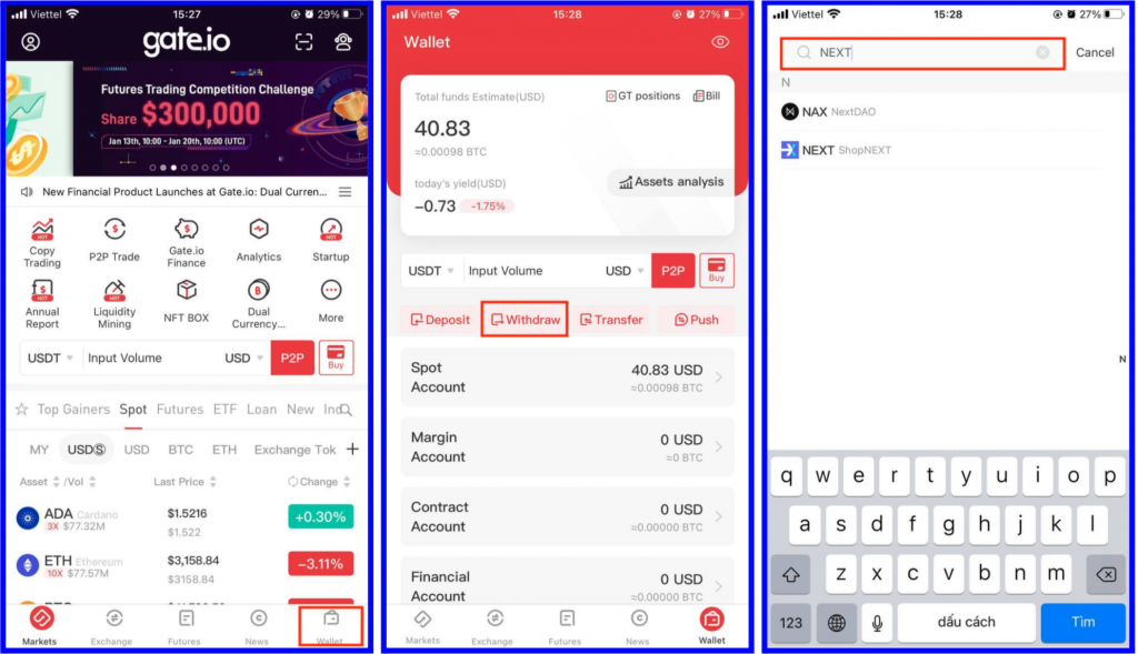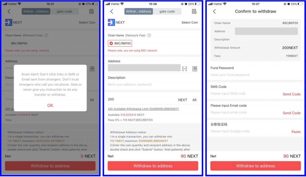 Bước 5 : Tiếp theo, chúng tôi sẽ hướng dẫn bạn cách rút NEXT ra khỏi Gate.io đến bất kỳ ví BEP-20 nào. Từ màn hình chính, nhấn Wallet sau đó nhấn Rút tiền và nhập NEXT vào thanh tìm kiếm. Tiếp theo, bạn cần nhập địa chỉ bạn muốn rút đến và số tiền bạn muốn rút. Gate sẽ yêu cầu bạn gửi mật khẩu Fund và các mã bảo mật khác trước khi chấp nhận giao dịch rút tiền của bạn.