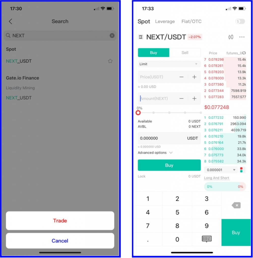 Bước 4 : Bây giờ bạn đã sẵn sàng mua NEXT trên ứng dụng Gate.io của mình. Nhấp vào biểu tượng tìm kiếm trên màn hình chính. Sau đó, nhập NEXT và chọn giao dịch cặp NEXT_USDT . Trên màn hình giao dịch NEXT/USDT, bạn có thể nhập giá bạn muốn mua NEXT trong ô Giá (USDT) và số lượng NEXT bạn muốn mua trong ô Số tiền (NEXT). Ở đây, chúng tôi giả sử bạn có sẵn một số USDT trong tài khoản Gate của mình. Bạn có thể làm theo hướng dẫn này để mua USDT từ Binance P2P và gửi đến Gate.io. Xin lưu ý rằng đây là lệnh hạn chế, vì vậy bạn phải đợi một thời gian để lệnh của bạn được thực hiện, nghĩa là chờ một người muốn bán NEXT cho bạn với mức giá bạn đã đặt mua.