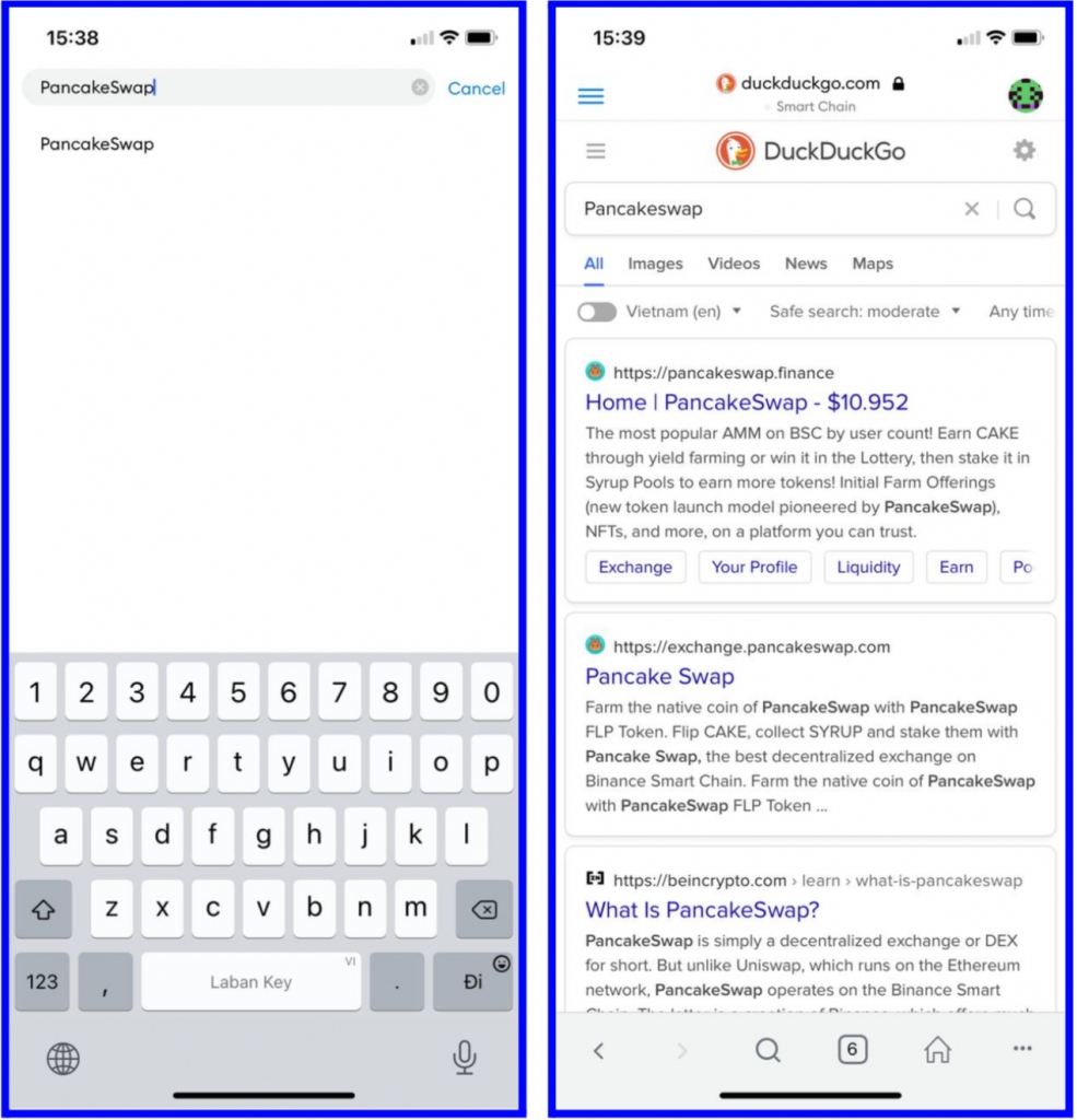 Bước 1 : Mở ứng dụng Metamask của bạn, sau đó nhấn biểu tượng Menu trên màn hình chính, sau đó nhấn Trình duyệt. Nhập PancakeSwap trên thanh tìm kiếm và chọn kết quả đầu tiên https://pancakeswap.finance/ . Tiếp theo, chúng ta sẽ kết nối PancakeSwap với Metamask của bạn để hoán đổi token trực tiếp trên ví.